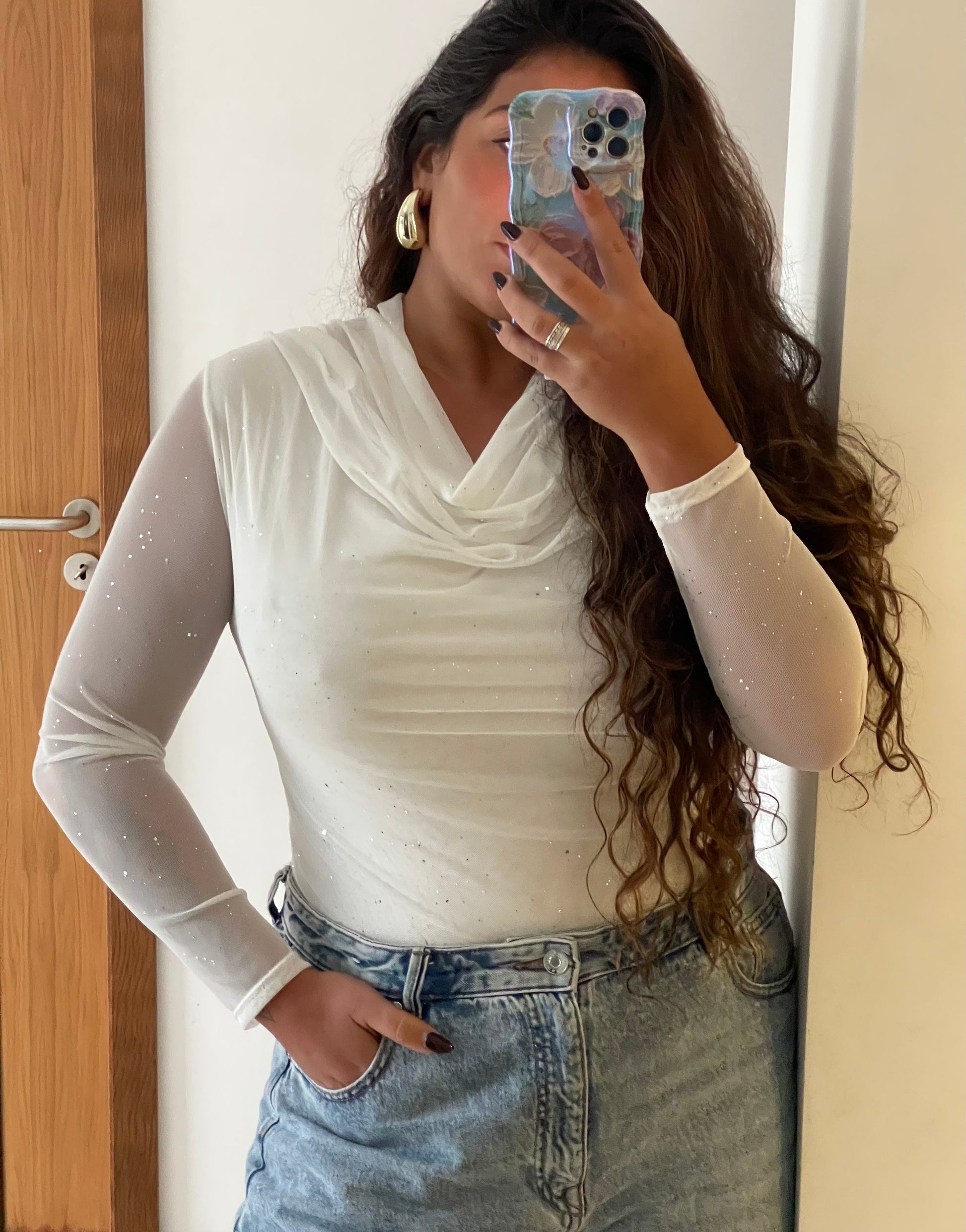 - Toda em tule elástico com detalhe em brilho prateado