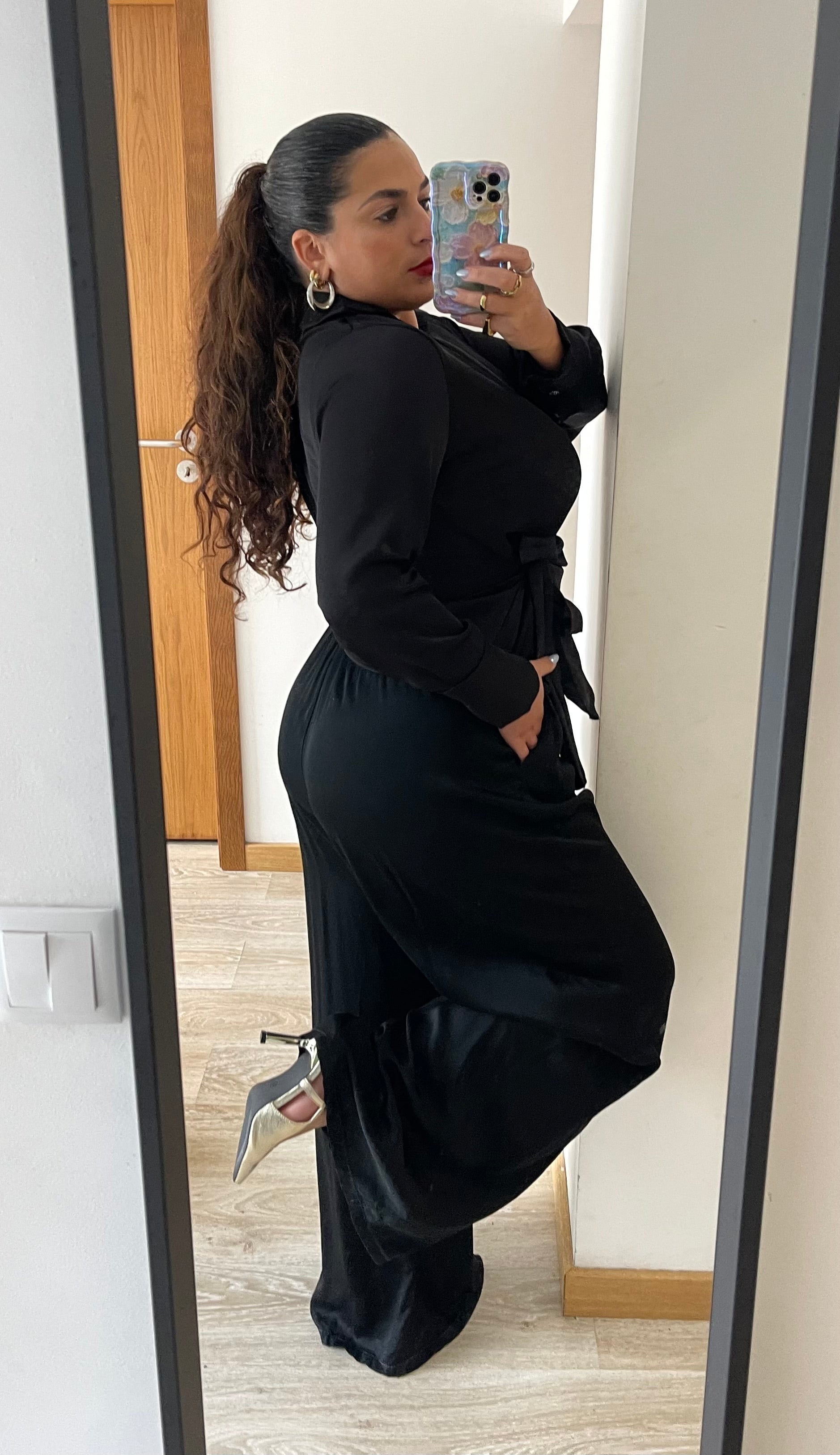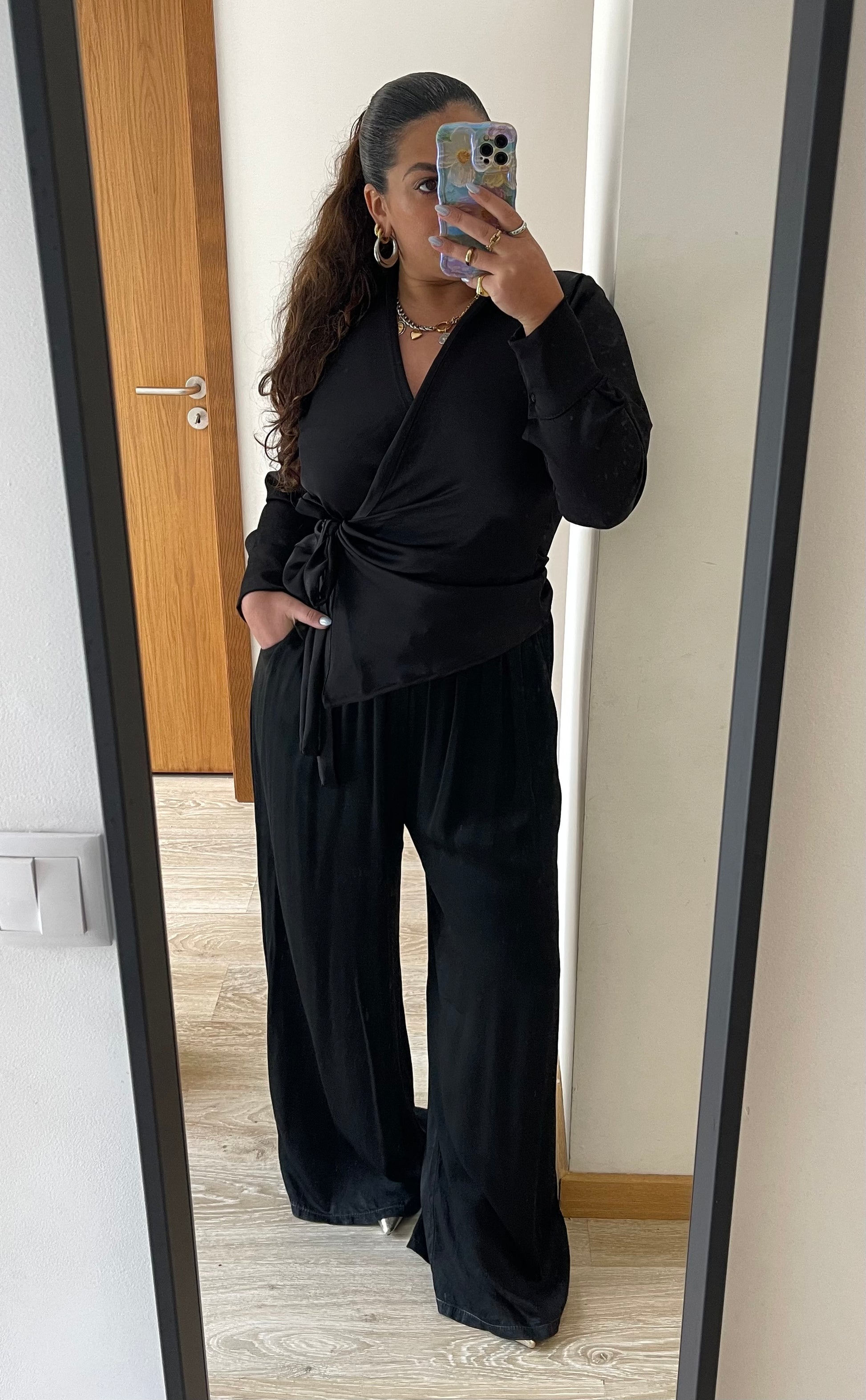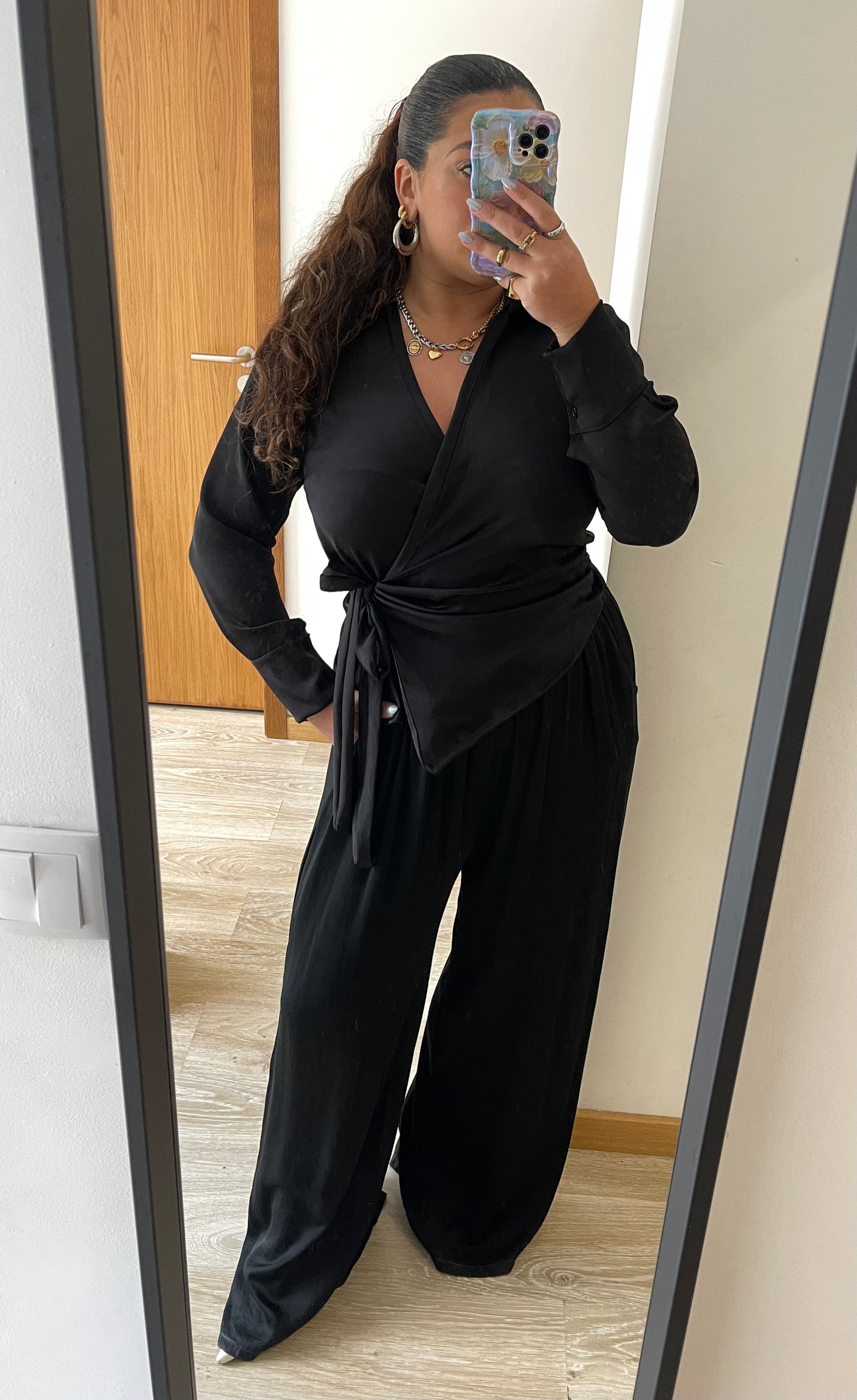 Top de trespasse com design sofisticado, apresentando decote em V e mangas compridas com punho fechado em botões. Detalhes de amarração lateral e gola de abas conferem elegância. Peça atemporal que combina conforto e estilo.