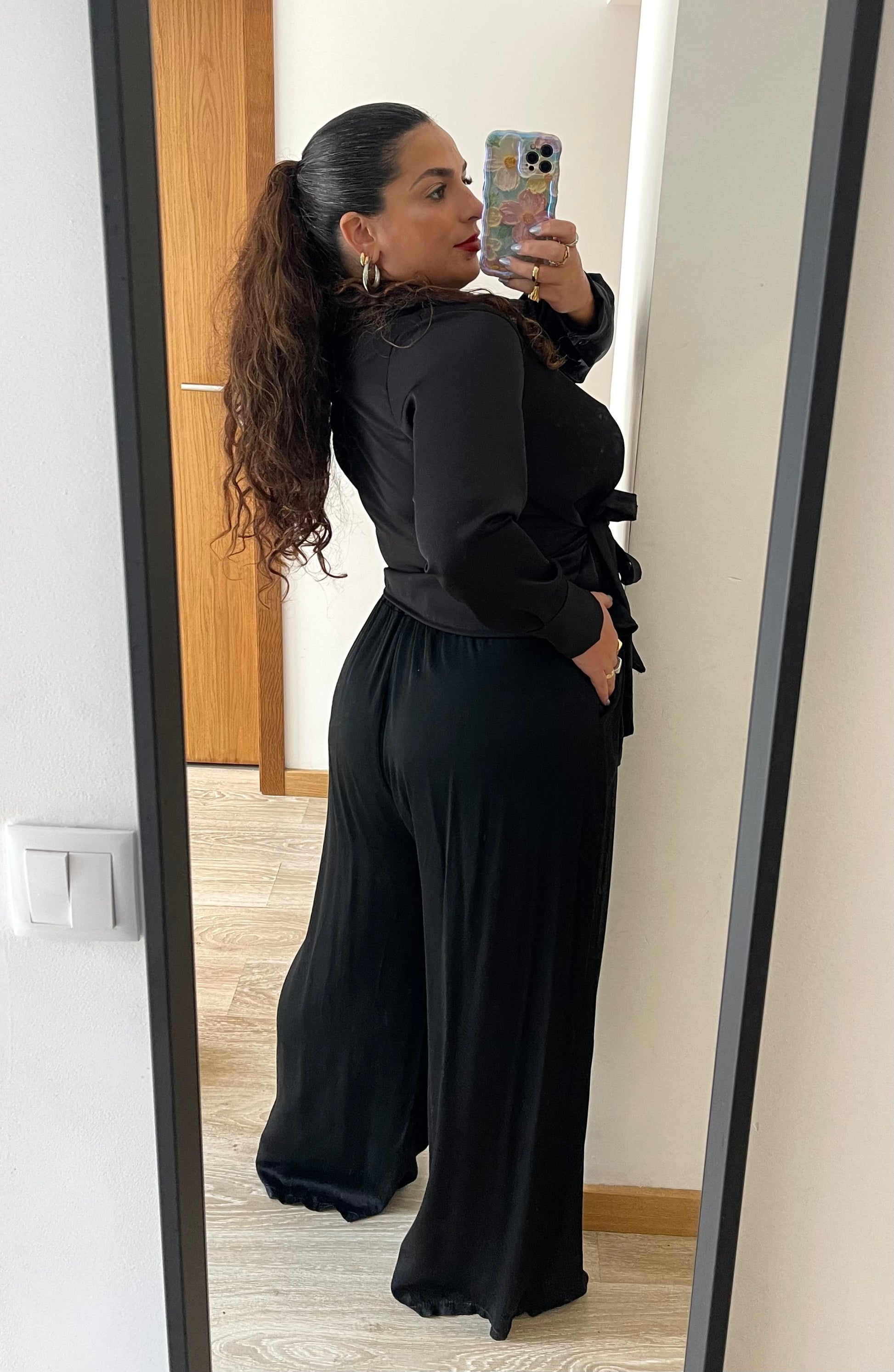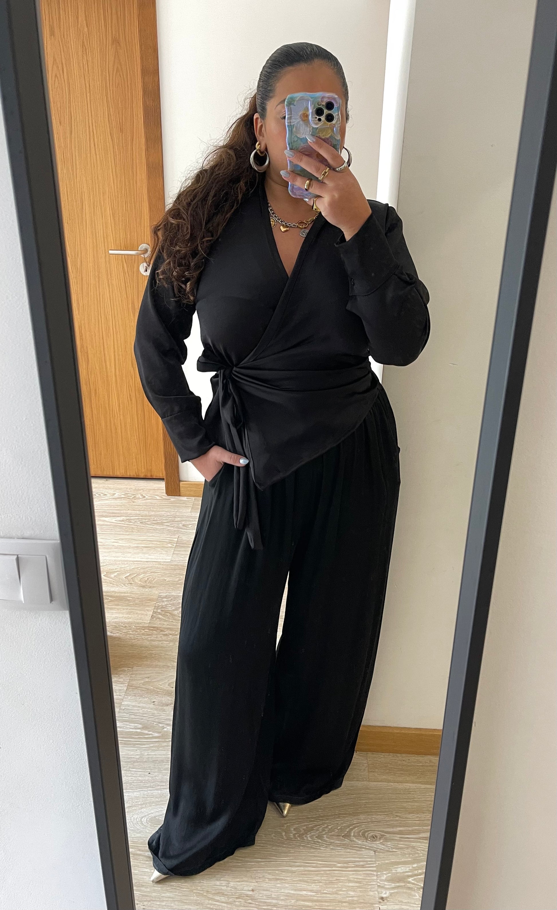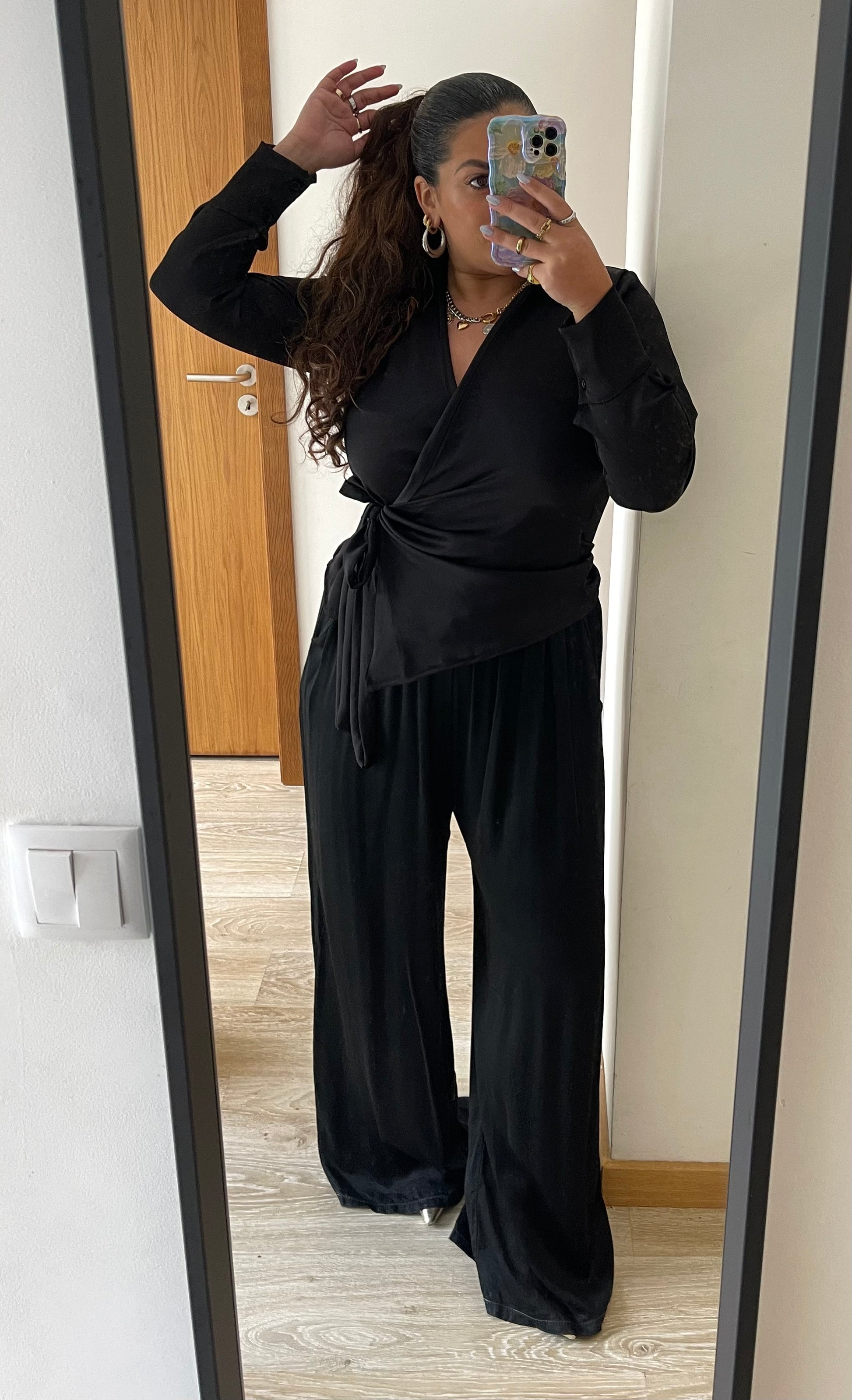 Top de trespasse com design sofisticado, apresentando decote em V e mangas compridas com punho fechado em botões. Detalhes de amarração lateral e gola de abas conferem elegância. Peça atemporal que combina conforto e estilo.